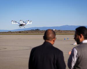 исполняющий обязанности администратора FAA Билли Нолен и руководитель отдела OEM-производителей самолетов Джоби Дидье Пападопулос наблюдают за полетом полностью электрического самолета Джоби -вылет в аэропорту Марина в Калифорнии. (Изображение: Joby Aviation)