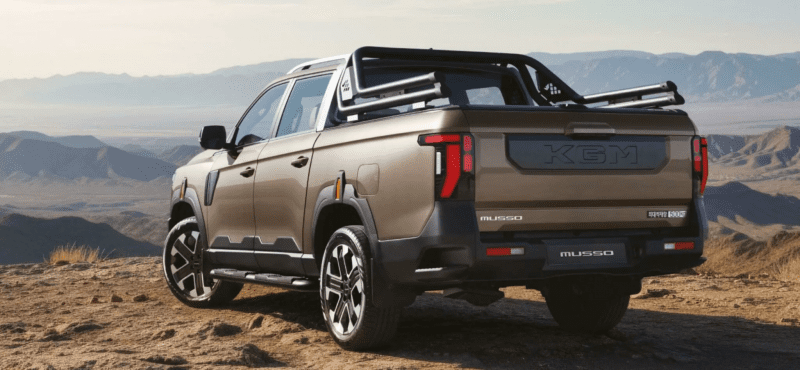 Боковые панели оснащены пластиковыми накладками и встроенными желтыми поворотниками. Задняя часть получила вертикальные светодиодные фонари, скульптурный капот с логотипом KGM и обновленный бампер со встроенными подножками. Над грузовым отсеком установлена трубчатая спортивная арка.