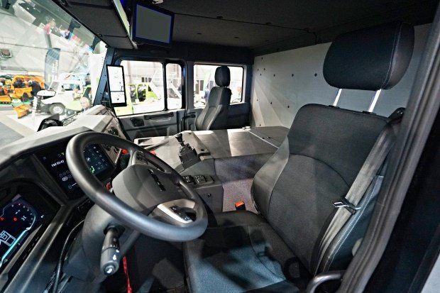 Tatra e — Drive BEV 8×8 получил штатный кузов-самосвал. Общий вес — 44 тонны, полезная нагрузка — 22 тонны, за кабиной установлены два эффективных кулера силовой электроники и модули терморегуляции аккумуляторных батарей. Внутри — цифровая приборная панель, система камер вместо зеркал и светодиодная подсветка.