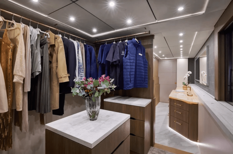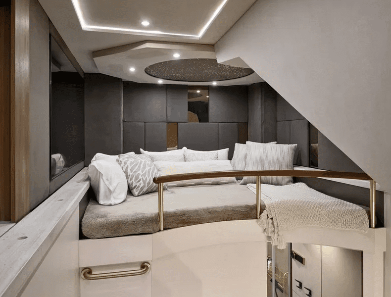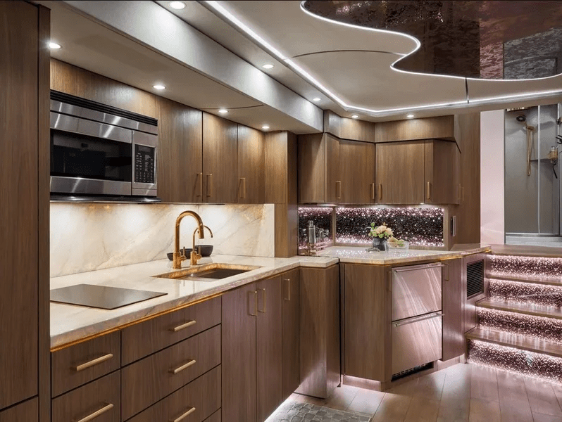Интерьер был оборудован 8 кроватями, 3 ванными комнатами, гостиной, полноценным гардеробом и большой кухней со скрытой барной стойкой. Кроме того, здесь есть два домашних кинотеатра, мощная акустическая система, настоящий камин и регулируемое освещение, имитирующее звездное небо на потолке.