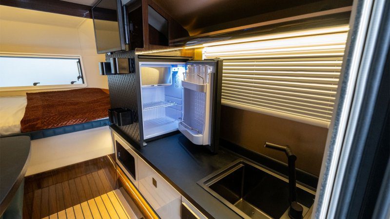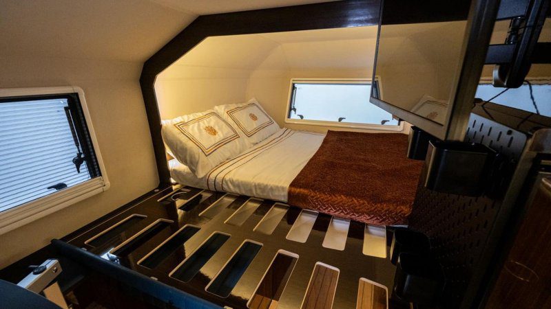 Пол покрыт деревом и напоминает яхту. Модуль получил теплоизоляцию толщиной 20 мм, что позволяет использовать его в холодную погоду. Конечно, есть нагреватель и кондиционер.