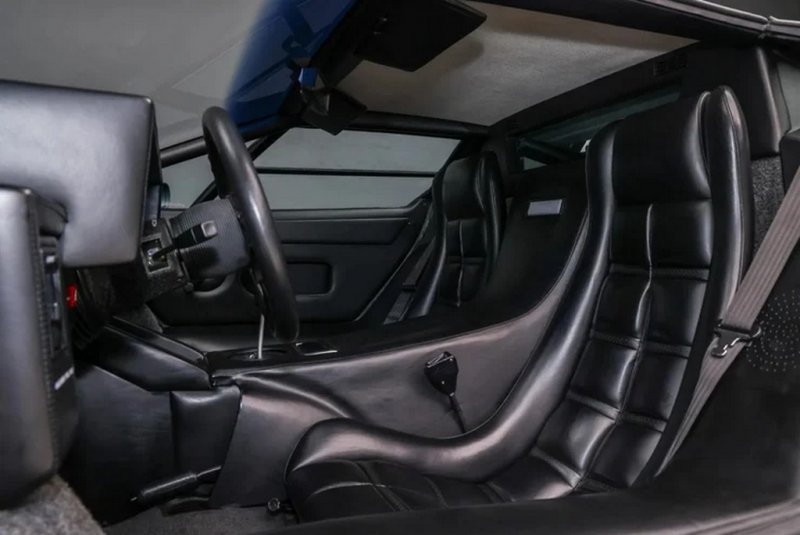 Салон Lamborghini Countach LP 5000 QV отделан черной кожей. В комплектацию входят золотые 15-дюймовые колеса, кондиционер, магнитола Alpine и гигантское антикрыло.