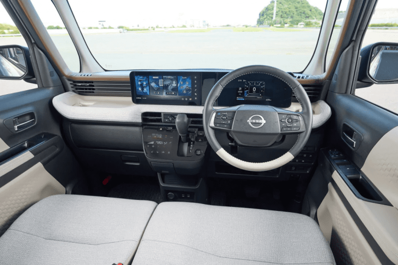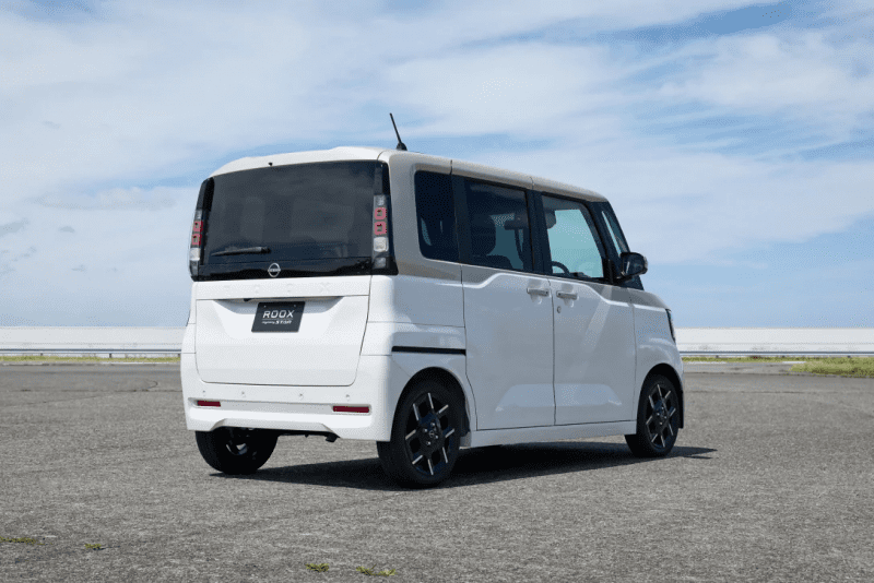 Nissan Roox 2025 года имеет рубленую конструкцию с коротким высоким капотом и вертикальными задними багажниками на крыше. Он имеет оригинальный передний дизайн и раздвижную заднюю дверь.