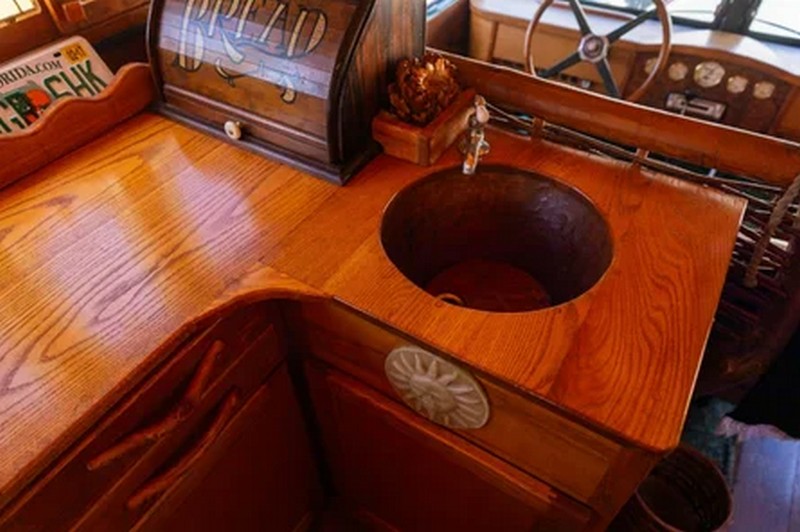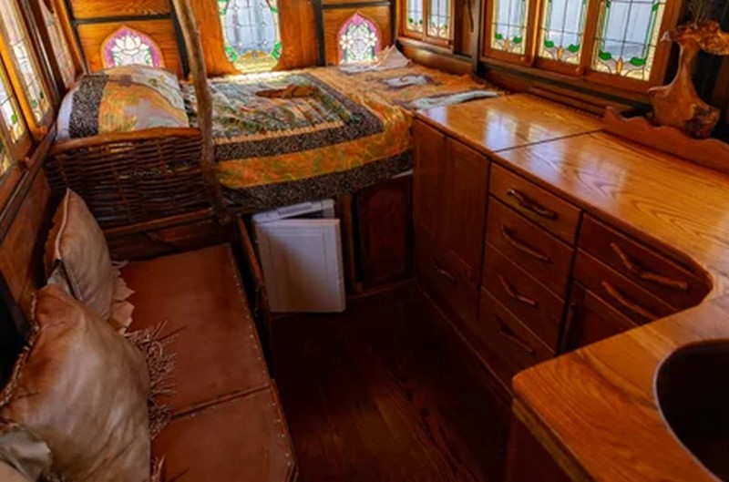 Дом на колесах построен на шасси грузовика Chevrolet 1928 года. Его жилищный модуль полностью выполнен из дуба и имеет 21 окно с витражами.
