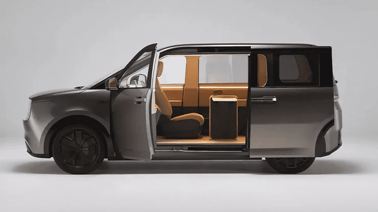 Минивэн Sharp имеет характерный двухобъемный силуэт с высоким капотом, а его задние двери скользят. Светодиодные фары и светильники соединены диодными полосами.