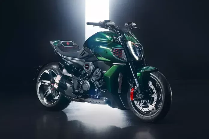 Летом 2022 года британский автопроизводитель представил новую машину ручной работы – купе Mulliner Batur. Самый мощный серийный автомобиль бренда будет выпущен тиражом всего 18 единиц, а теперь марка анонсировала весьма необычную «опцию» для Bentley Mulliner Batur – мотоцикл Ducati Diavel for Bentley. Над мотоциклом работали как специалисты Mulliner, так и дизайнеры отделения Stile Ducati. Источником вдохновения для 168-сильного Ducati Diavel for Bentley стало британское купе. Для покраски использован изумрудно-зеленый оттенок Scarab Green из палитры Mulliner, а штатные диски заменили спроектированными для спецверсии колесами цвета Dark Titanium Satin. Седло, обтянутое черной алькантарой с красной основой и вышитым логотипом Bentley, вдохновлено интерьером автомобиля. с линиями мотоцикла. Боковые воздухозаборники стилизованы под двухцветную решетку радиатора Batur, переднее крыло, обтекатель и топливный бак сверху напоминают ребра на капоте, а задний обтекатель стилизован под корму британского спорткара. Большинство внешних деталей мотоцикла изготовлено из углеродного волокна.